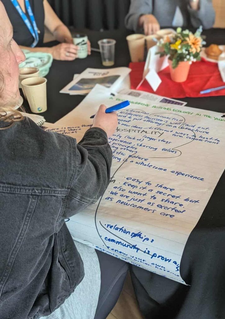At the conference, we invited participants to imagine together what a regenerative hosting ecology in the Yukon might look like – and what it might require. Sixteen tables of five or six people each got a flip chart with a tree drawn on it, where they were invited to make notes from their conversation.